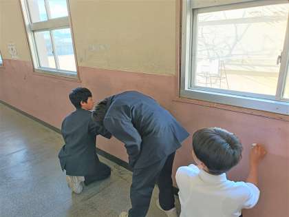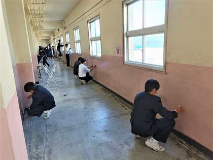 教室だけでなく、廊下の窓や壁も磨いてきれいにしています。