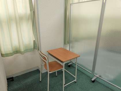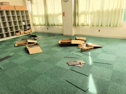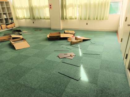 教室に入りづらい生徒や登校しづらい生徒が登校して、学びをすすめていくためのサポートルームの床を、管理作業員さんがカーペットに模様替えしています。登校した生徒は、自分のペースに合わせて、プリントやパソコンを使って学習を進めていきます。