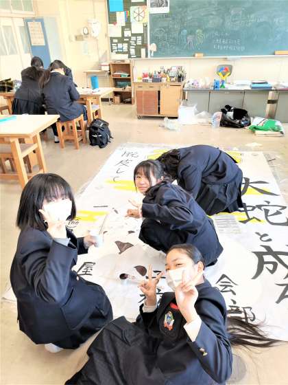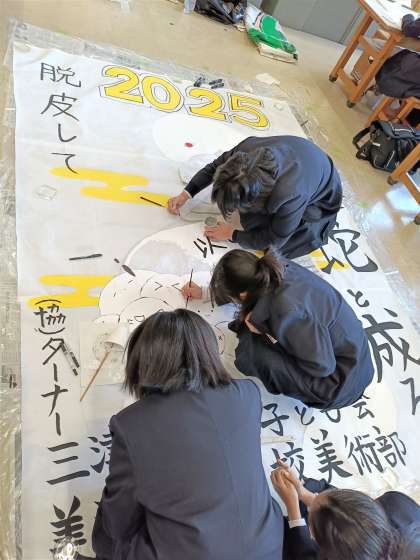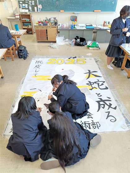 1月19日(日)13時から淀川右岸 西中島地区河川敷で行われる「新春たこあげ大会」にあげる大凧のデザインを美術部がおこなっています。今年は、縁起のいい動物として信仰の対象にもなっている「白蛇」。昨年は、残念ながら上手くあがりませんでしたが、今年はリベンジです。