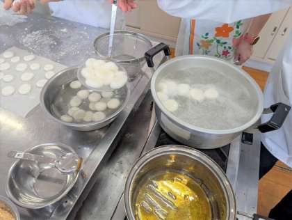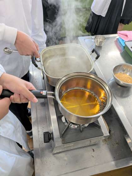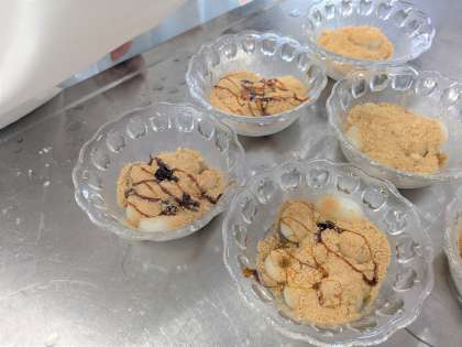 トッピングは、きな粉とカラメルソース。カラメルソースは、小鍋に砂糖を煮詰めてお湯を足して仕上げます。あっという間に焦げるので、タイミングが大事でした。