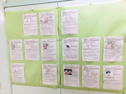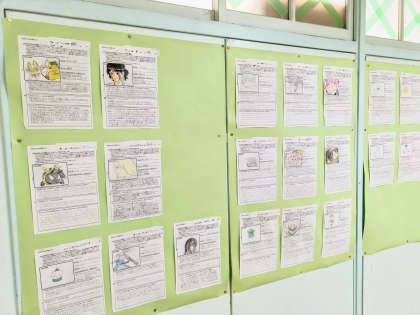本館3階美術室前の廊下には、2年生の冬休みの課題「自分の好きな漫画(アニメ)について調べてみよう」が張り出されています。今や日本の文化となったアニメですが、展示作品には、ジブリ作品やドラえもんなどの有名なアニメなど様々な作品についてレポートされています。