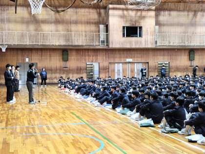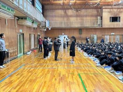 まず初めに、ソフトテニス部の賞状伝達が行われました。今回は、惜しくも3位でしたが、次回は優勝できるように声をしっかり出して練習すると話してくれました。