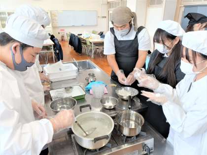 みんなで協力して、白玉粉を練って丸めて茹でて、白玉団子を作っています。