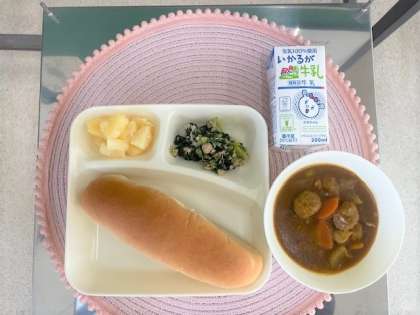 給食の肉だんごは、牛肉、豚肉(ぶたにく)、鶏肉(けいにく)、たまねぎ、でんぷん、塩、砂糖、こしょう、香辛料(こうしんりょう)などを混ぜ合わせて、丸めて作られています。スープや煮物などに使われています。今日の給食では、「ミートボールと野菜のカレー煮」に使っています。