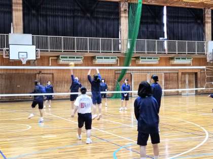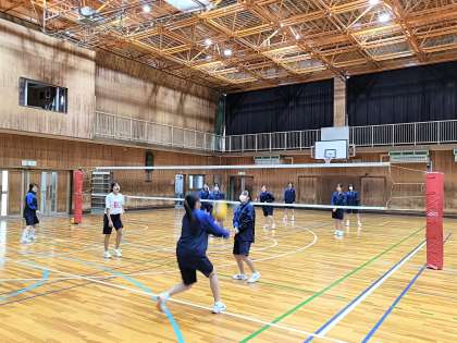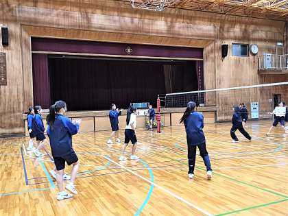 今日は、体育館でチームに分かれて試合をしています。ネット際のファインプレーも見られ、点数が入ったときには、チームみんなで喜んでいました。