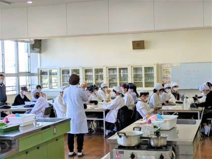 2年生の家庭科では、「防災食」をテーマに、もしもの災害に備え、アルファ化米や耐熱性ポリ袋を利用した調理実習をしました。