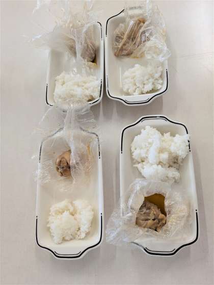 非常食であるアルファ化米には、お湯を注ぎます。ポリ袋に入れた鶏もも肉としょうゆ、砂糖を加えお湯の中で沸騰加熱すると、白ごはんと鶏肉の照り焼き風おかずができあがりました。