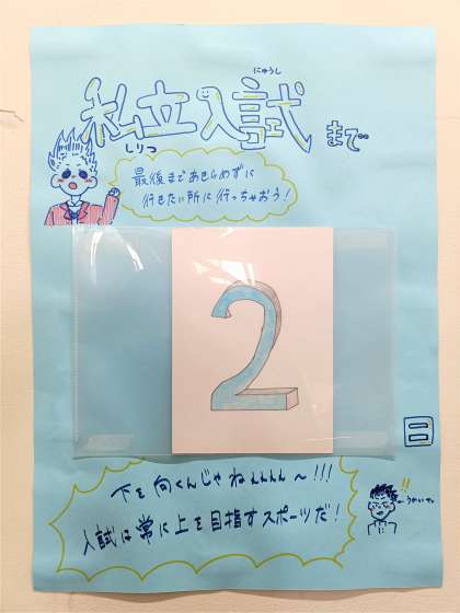 3年生校舎の階段踊り場に掲示された、カウントダウンメーター。いよいよ私立高校受験まであと2日となりました。週明けの月曜日が入試の日です。この2日間は無理をせず、万全の態勢で試験当日を迎えましょう。