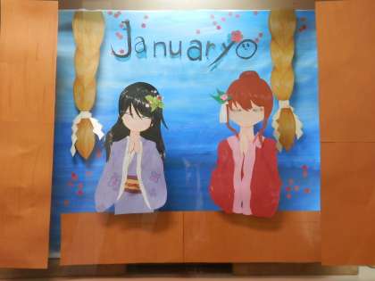 一つは初詣。女の子が二人寄り添ってお参りしています。小物は少なく、背景はシンプルに。その代りに神社の柱や賽銭箱などは大きくわかりやすく目立つように。背景は桜を散らつかせ空は青く青く鮮やかに。全体的にさっぱりした作品に仕上げました。