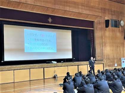 毎年、美津島中学校では1年生で職業講話を行っています。少し前になりましたが、今年も1年生で9業種の方々にきていただき職業講話を行いました。今日は、「働く」ということについて考えてみます。