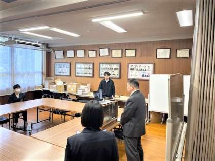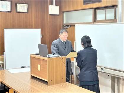 校長先生のお話の後、ソフトボールのクラブチームの一員として出場した夏の全国大会で3位の成績を残した3年生女子生徒に教育長表彰の伝達を行いました。