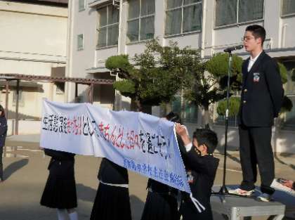 生徒会長から今学期の生徒会の目標について、3学期の締めくくりとして初心に戻り「生活態度をきっちりとして、きちんとした日々を過ごそう」と話がありました。目標は正門に掲示しています。