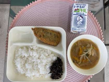 いわしには、筋肉や血液をつくるもとになるたんぱく質のほかに、脂質(ししつ)も含まれています。今日の給食では、「いわしフライ」として出ます。骨ごと食べられるため、骨や歯を丈夫(じょうぶ)にするカルシウムもたくさんとることができます。