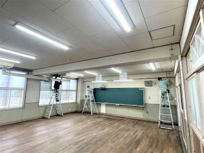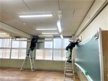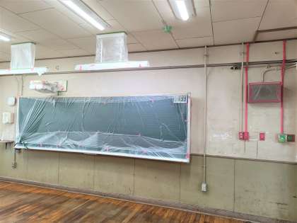 本日より2週間の予定で、3年生が使用していた教室壁の塗装作業が行われます。今日は、養生作業が行われています。