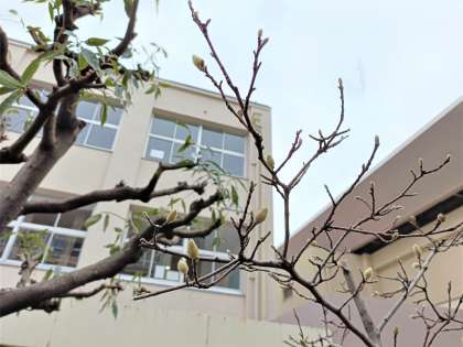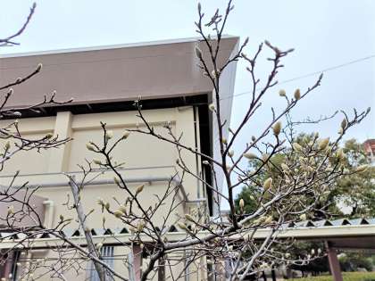 中庭のネコヤナギの木には、かわいらしいふさふさの蕾がついています。