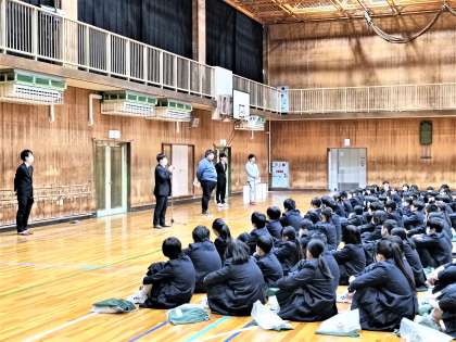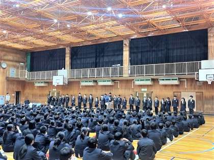 校長先生からは、チャレンジテストや生徒アンケートからわかる1・2年生の現在地についてお話がありました。生徒指導主事からは、春休み中の生活についてや校則見直しについてのお話がありました。