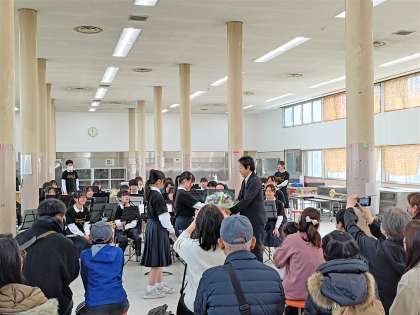 今年度で転勤される顧問の先生へ花束を渡しています。