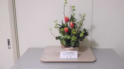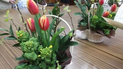 今年度、最後のアレンジメントフラワー教室(15:00〜16:00 本校中会議室)が、PTA成人委員会主催で開かれました。講師の先生方を含め12名の皆さんが熱心に取り組んでいました。『チューリップ・菜種(なたね)・丸場ルスカス(まるば)・黄金葉(おうごんば)』