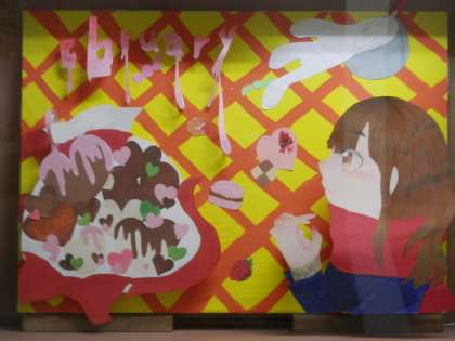 かわいらしさを頑張って出しました。ハートは、いろいろな形でたくさんの気持ちを表し、袋の中にはたくさんの想いが入っています。バレンタインに贈る小物でいっぱいにしました。[ February ]のところは、赤色でグラデーションをし、いちごのチョコを表現しました。