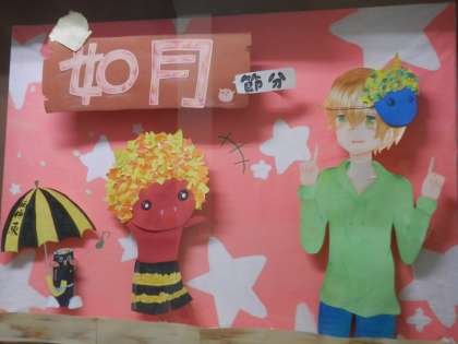 「可愛らしい鬼」と「恵方巻きくん」と楽しくおしゃべりしている男の子の様子を制作しました。楽しげな雰囲気を出すため、背景を☆柄にしました。他にも、如月の板の上に乗っている「ますくん」など可愛いキャラクターにも注目してください。