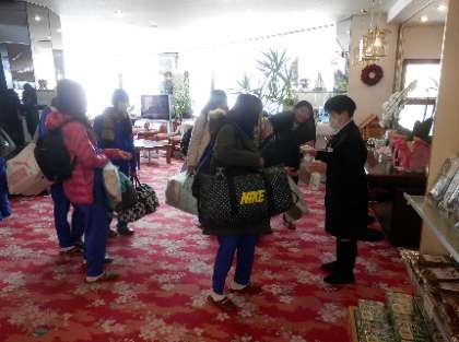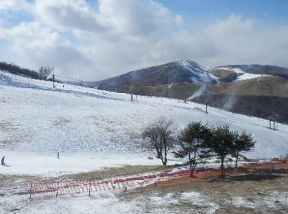 ホテル側の配慮で両手をアルコール消毒し、各部屋に入りました。部屋で更衣を済ませてからゲレンデに集合です。集合場所には、雪がありません。