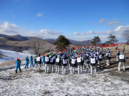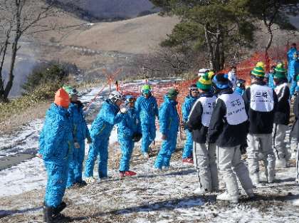 1回目のスキー講習が始まりました。開校式で、インストラクターの紹介です。全員そろって同じ班で卒業しましょう。頑張ろう!