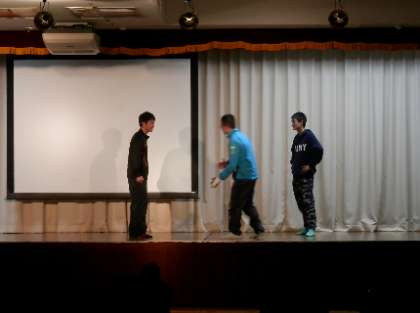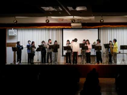 食事の後は、集いの館に集まって、夜レクを行いました。有志による出し物が工夫された演出で行われました。コントや吹奏楽部の生演奏によるイントロクイズもありました。