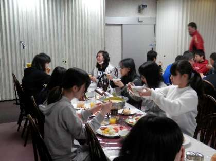 食事の後は、ゲレンデで学級写真を撮影しスキー講習に入ります。ごちそうさまでした!