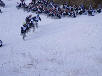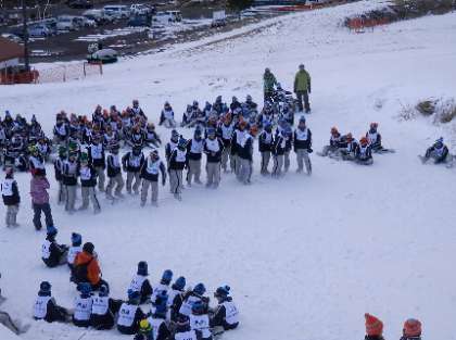 午後の講習会が終了した後は、雪上イベントを行いました。今回は、ホテル前ではなく、雪が少ないハーフパイプコースを使わせていただきました。イベント係の司会進行でいろいろと工夫された内容の競技が行われました。