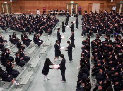 生徒会の進行により、1.2年生の在校生が見守る中、吹奏楽部の演奏で3年生が入場。