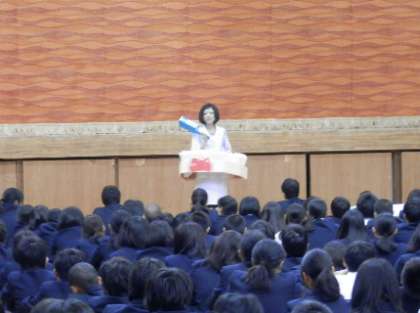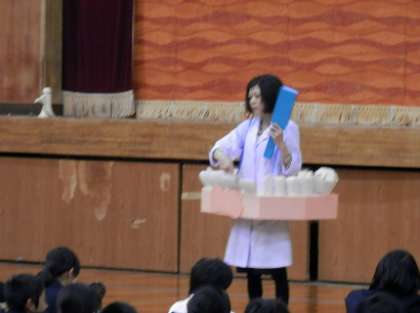1年生の朝の学年集会で歯磨き指導を行いました。