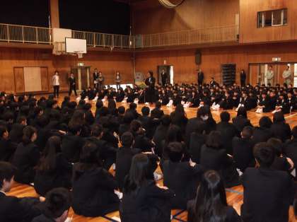 着任式、始業式に続き、生徒会主催の対面式を行い、新1年生の代表生徒と新3年生の代表生徒が、それぞれ言葉を述べました。