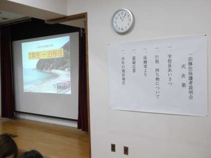 学校長あいさつの後、学年の先生方より、一泊移住についての説明がありました。