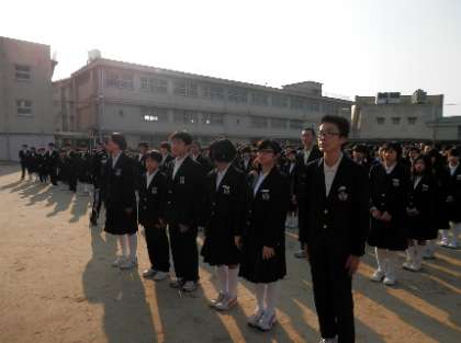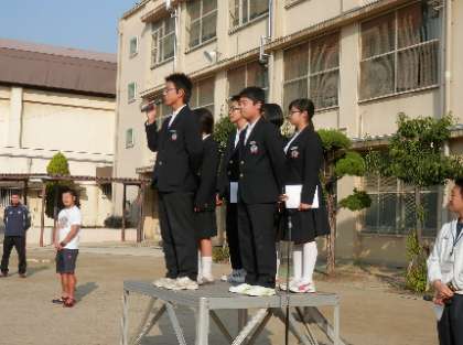 全校集会で、生徒会と学級役員の認証式を行いました。