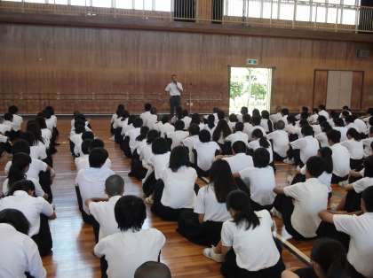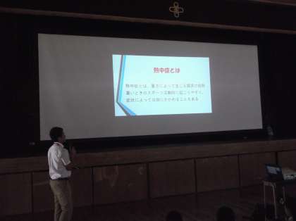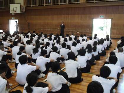 朝学活後、体育館へ移動、熱中症対策講座—校長講話—生徒指導主事の岩元先生より、夏季休業中の諸注意がありました。 二学期の始業式は、