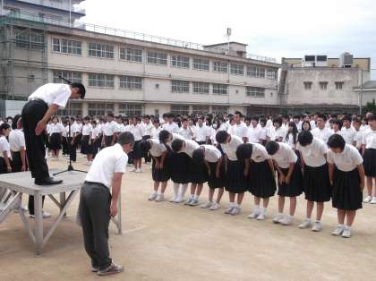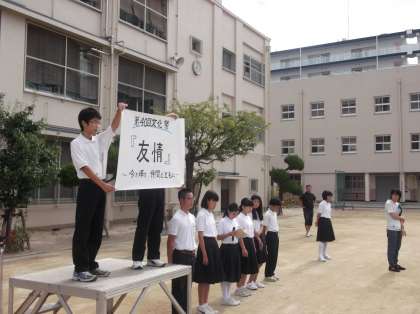 本日、全校集会に於いて、文化係より今年度の文化祭のテーマ『友情』の発表が行われました。 また、バレーボール部の、夏季4B大会 第3位の表彰がありました。
