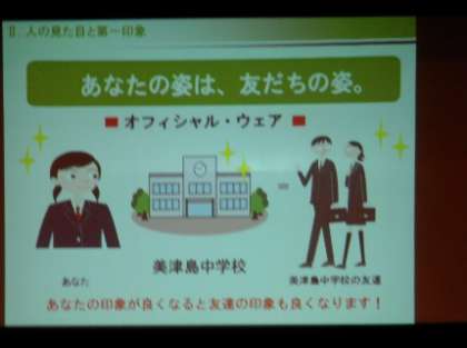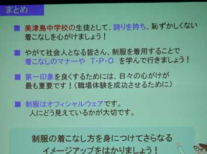 などに注意し、どこで問いかけられても、「美津島中学生です」と言えるようにしましょう。