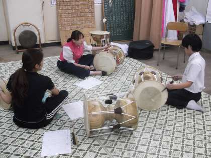 民族クラブ 活動 「チャンゴ」の演奏の様子です。