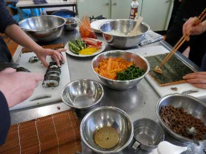 参加メンバーは、3年生から、1名、2年生から2名、1年生から2名、の生徒が参加しました。今回は、チヂミ、キンパ、ピントク、トックスープを作りました。