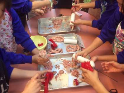 それぞれの班で悪戦苦闘しながらも、協力してウインナーを作りました。出来上がりは上々でした。
