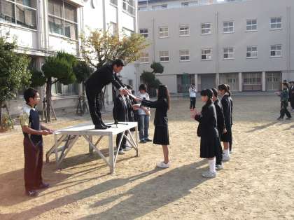 本日、全校朝礼にて、後期生徒会執行部役員・学級代表の認証式、及び軟式野球部 秋季4ブッロク大会 優勝、卓球部女子団体 秋季4ブロック大会 第3位の表彰がありました。