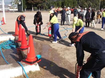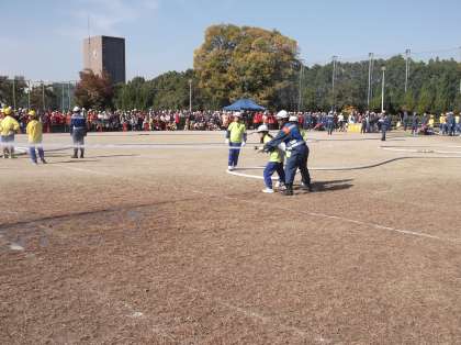 本日、晴天のもと、第4回神崎川流域合同防災訓練(グリーンセンター)が開催され、本校の防災リーダーが参加しました。『可搬動力ポンプ取扱い』『消火器取扱い』『心肺蘇生法』『外傷処置・運搬方法』『燃焼実験』『放水競技会』