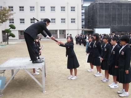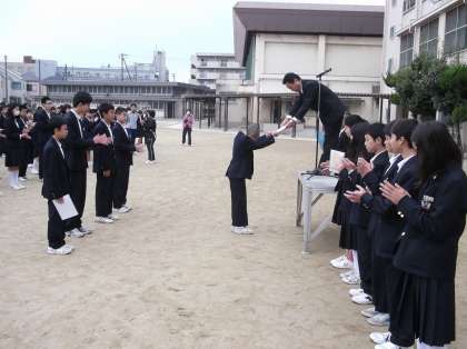 本日、全校朝礼にてあいさつ運動の表彰及び女子ソフトテニス部の表彰がありました。