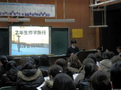 土曜授業の3限目に、2月18日から2泊3日で実施する修学旅行の説明会を音楽室で実施しました。