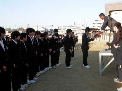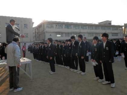 大寒の朝の全校集会。前日に行われた4ブロックのバスケットボール新人大会で男子バスケットボール部がみごとに優勝し、表彰の伝達を行いました。