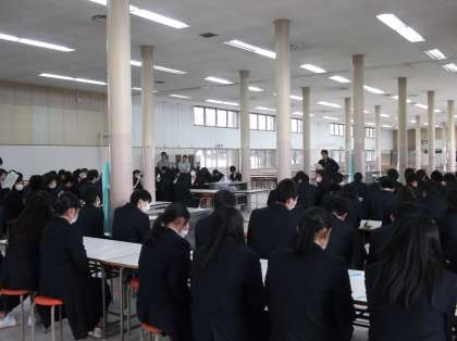 『3年生』:進路だより13を参照、進路指導主事の中島先生より、私立高校の出願についての話がありました。(ランチルーム)