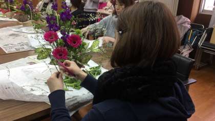 本日、PTA成人教育委員会主催の第4回アレンジメントフラワー教室が開催されました。『ストック』『菜種』『ガーベラ』『フロリダビューティー』『雪柳』を使用し、先生のご指導のもとに、それぞれ活けました。
