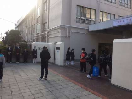 風紀委員と、卓球部員の人たちが、正門に立って元気にあいさつしてくれています。