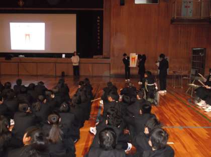 本日、6限目に体育館に於いて、1年生 保健委員の生徒が中心となり、歯と口の健康について講習を実施しました。