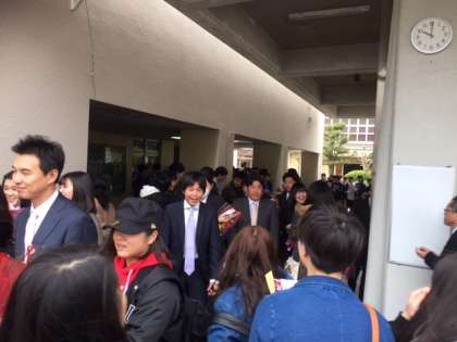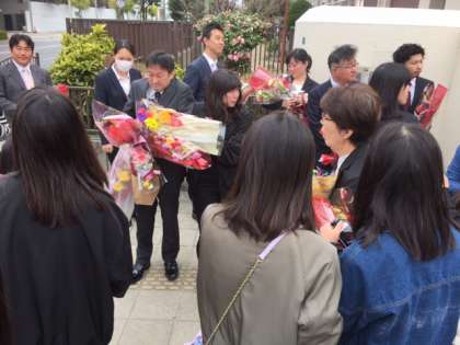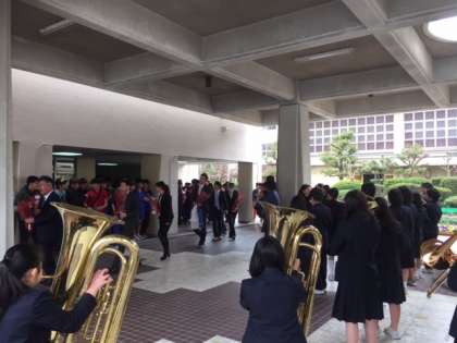 離任式が終わり、吹奏楽部の演奏でお見送りの様子です。